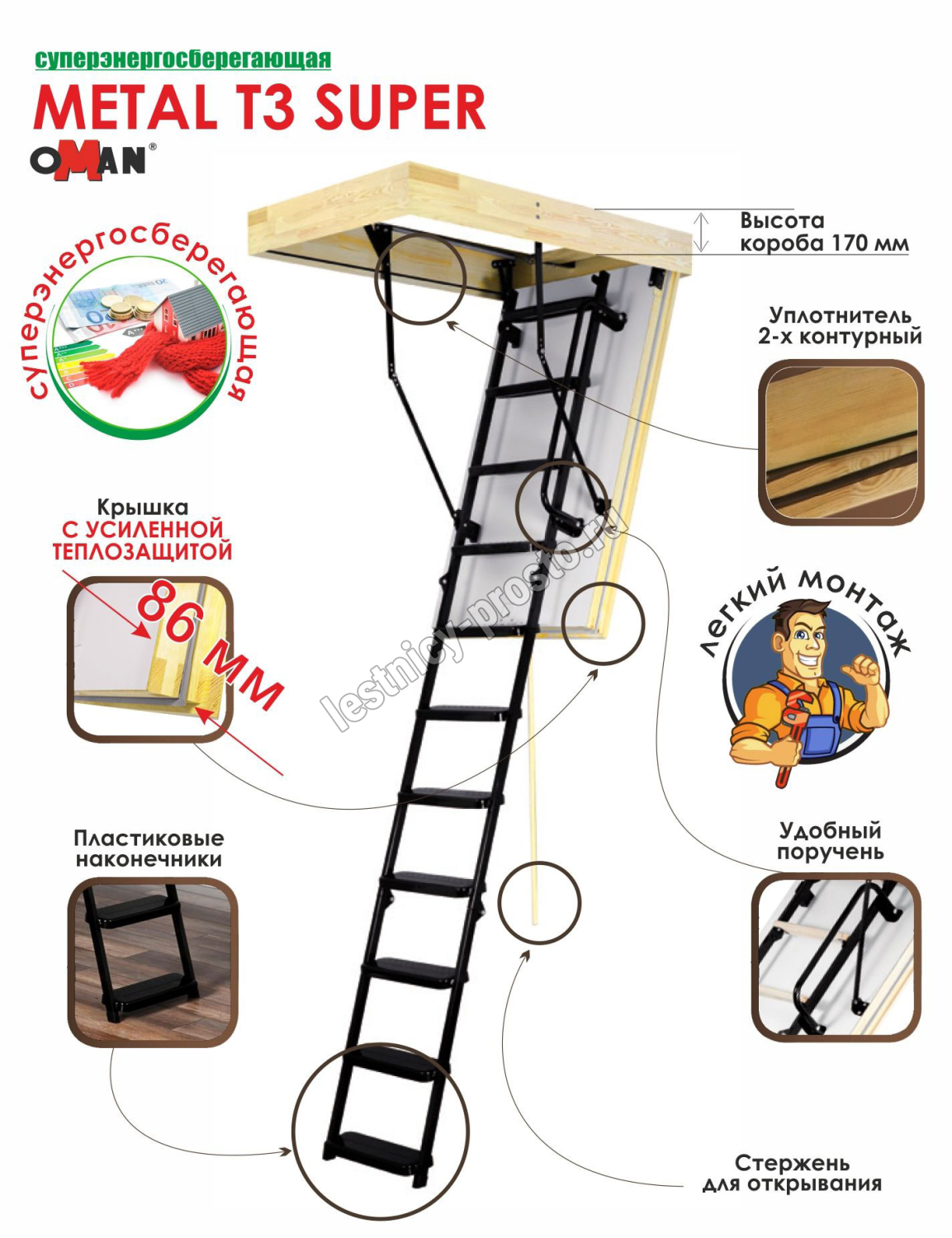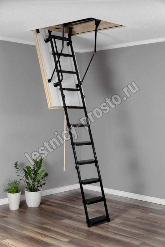 Лестница складная трехсекционная. Рабочая поверхность полностью выполнена из металла и покрашена порошковой краской. Термоизоляционная крышка типа "сэндвич", толщиной 86 мм, утеплена пенопластом, облицована с двух сторон ДCП белого цвета.