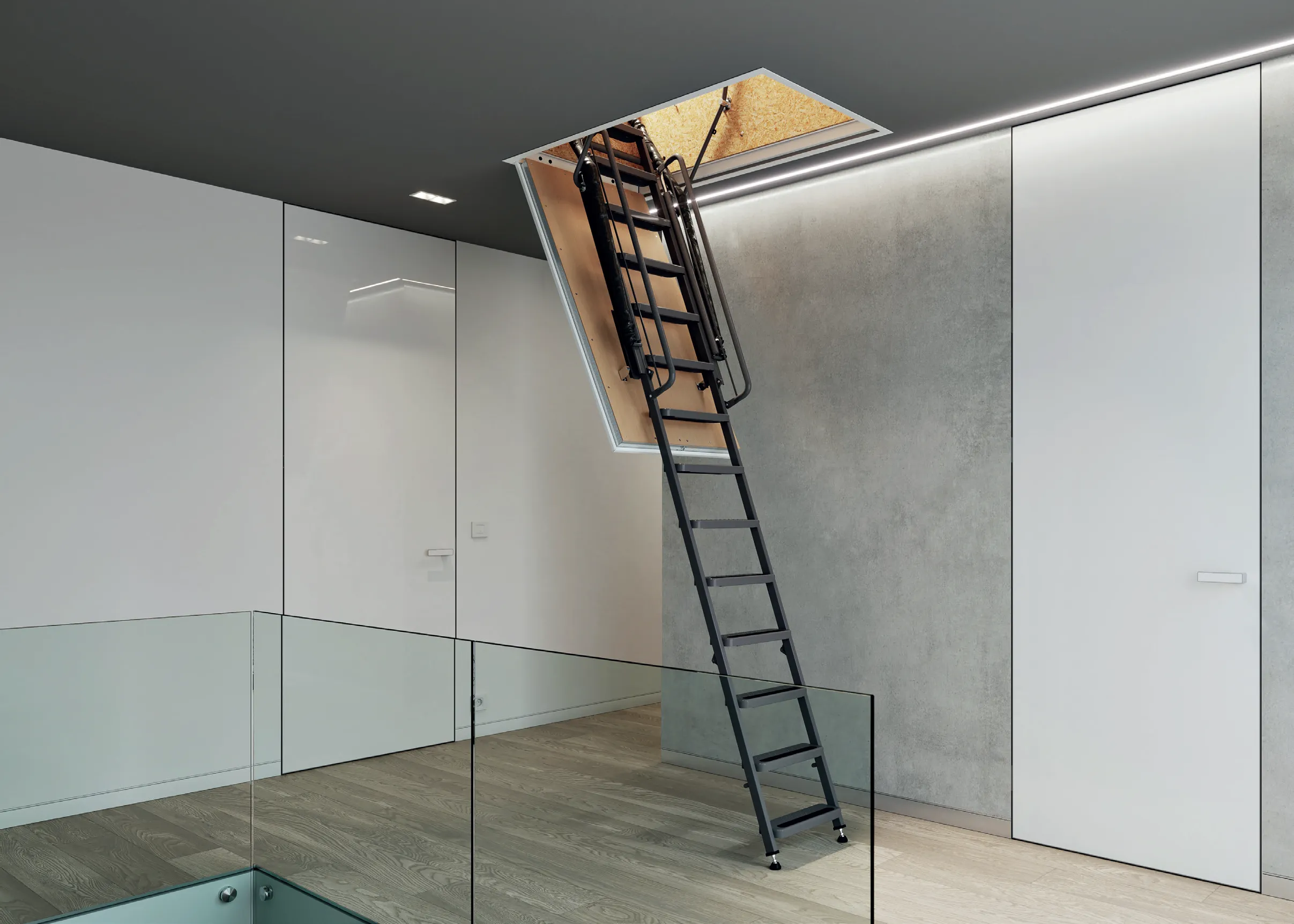 Лестница чердачная складная металлическая 3-х секционная. Ступени полностью выполнены из металла и покрашены порошковой краской. Лестница имеет 2 короба и 2 крышки люка. Нижняя крышка лестницы представляет собой многослойную конструкцию – деревянная рама, внутри которой находится теплоизоляция и противопожарная вставка. Внутренняя часть крышки покрыта оцинкованной жестью, наружная часть белой эмалью и защитной пленкой. Толщина крышки 60мм. Верхний люк выполнен из влагостойкой фанеры и обработан антигрибковым средством. Короб металлический высотой 140мм по периметру проходит уплотнитель. Все соединяющие части изготовлены из твердого материала и имеют оцинкованное покрытие.