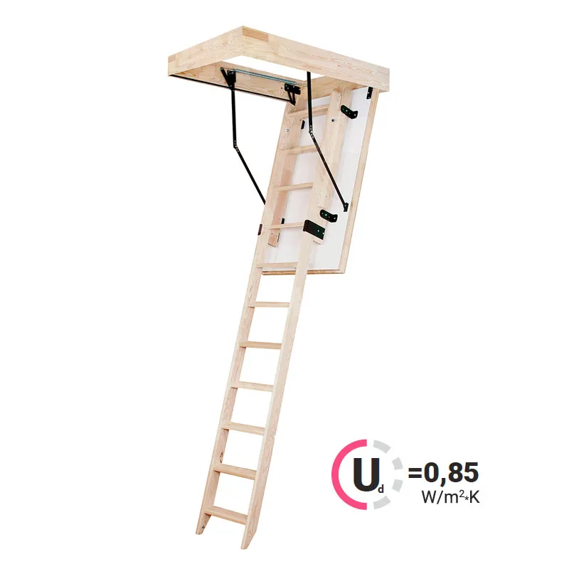 Двухсекционная раздвижная чердачная лестница LDK предназначена для помещений, где недостаточно места для складных лестниц. Данная модель также хорошо сохраняет тепло (толщина крышки с утеплителем – 36 мм), проста, удобна и безопасна в использовании, как и лестницы Smart и Komfort, но в тоже время позволяет максимально экономить драгоценное свободное пространство в доме. Крышка люка облицована ДВП белого цвета, что делает ее практически незаметной при установке в светлом или белом потолке. Для большего удобства и безопасности эксплуатации лестница LDK оснащена боковым металлическим поручнем и противоскользящими выемками на ступенях.
