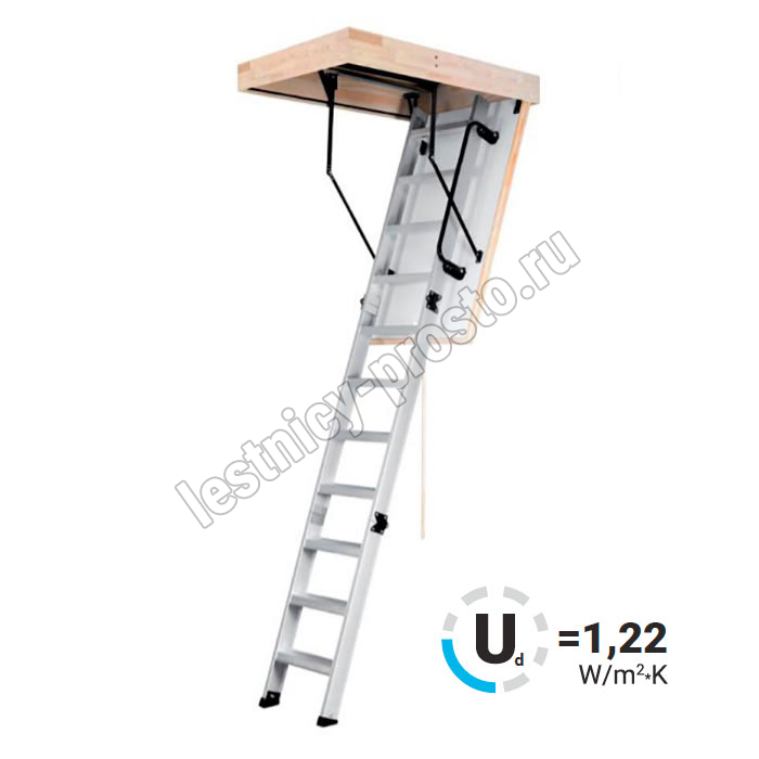 Складная 3-х секционная чердачная лестница. Рабочая поверхность полностью выполнена из алюминия. Термоизоляционная крышка типа "сэндвич" имеет усиленную теплозащиту, облицована с двух сторон ДВП белого цвета. По контуру короба имеется уплотнитель; Все металлические элементы лестницы покрыты порошковой краской.