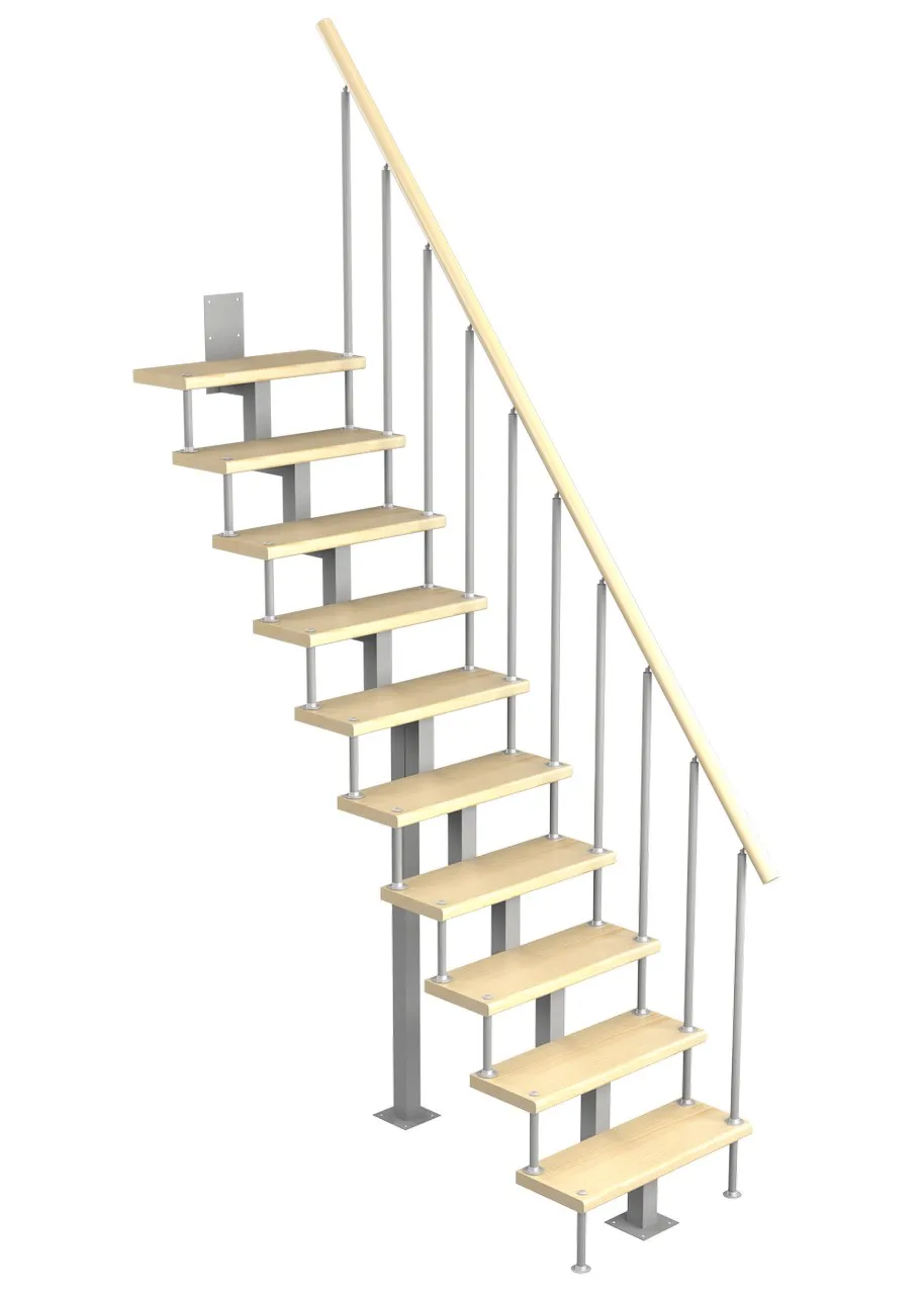 Удобная поворотная лестница на второй этаж. Дополнительные ограждения по первому маршу обеспечивают безопасность при подъеме и спуске, кроме того, небольшой угол подъема открывает всю площадь ступеней. Монтаж осуществляется силами двух человек на объекте по указаниям, приведенным в паспорте на лестницу.