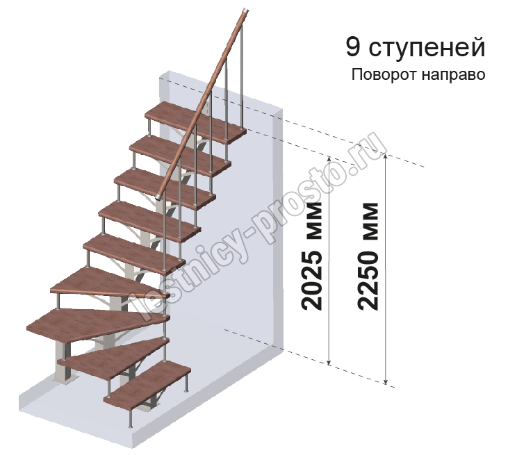 Комплект ограждений для Г-образной лестницы PROSTO MONO из 9 ступеней.