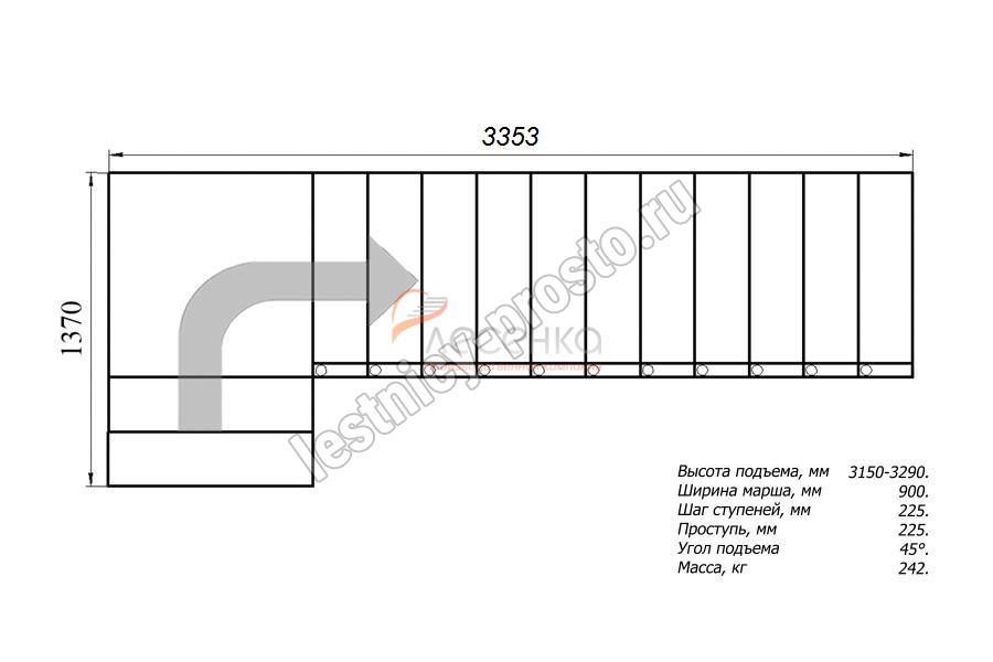 Модульная лестница Статус 225 3150-3290, Серый, Лиственница, Нержавеющая сталь