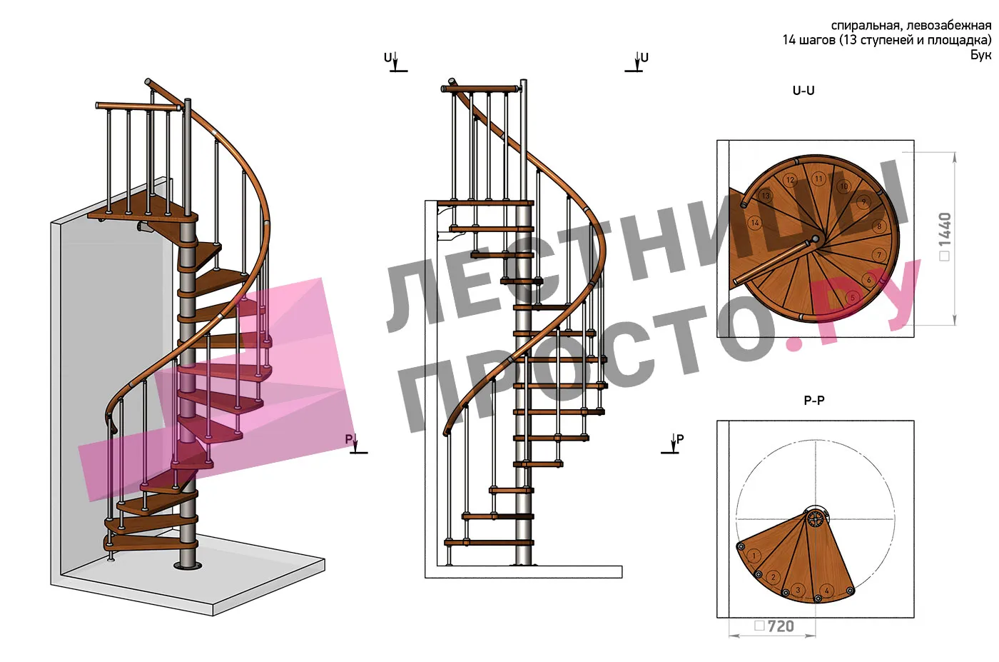 Винтовая лестница Prosto Spiral Black D140см, h303.9-348,1 см, бук