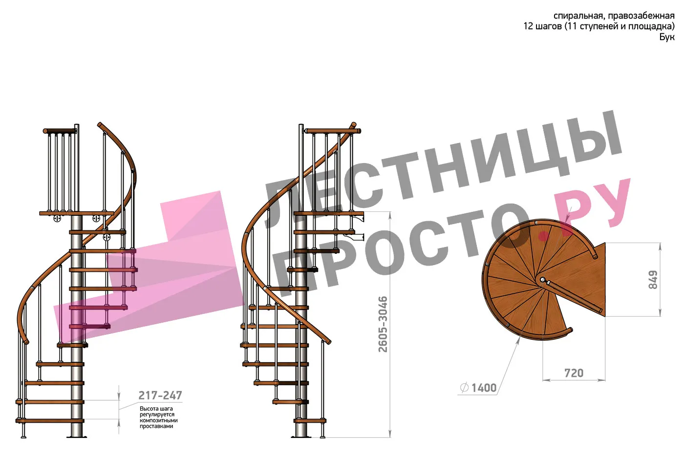 Правая, d=140см, 12 ступеней + площадка