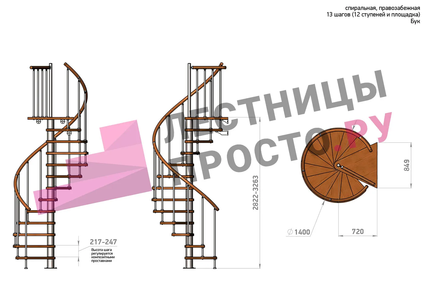 Правая, d=140см, 14 ступеней + площадка