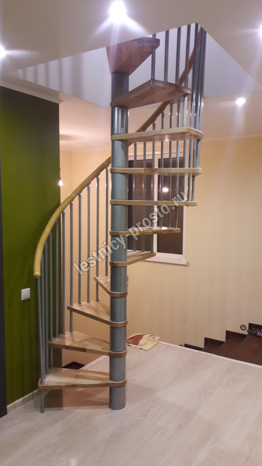 Поручень изготовлен из массива дуба в тон ступеням. Поручень и ступени лестницы покрыты износостойким защитным лаком.
