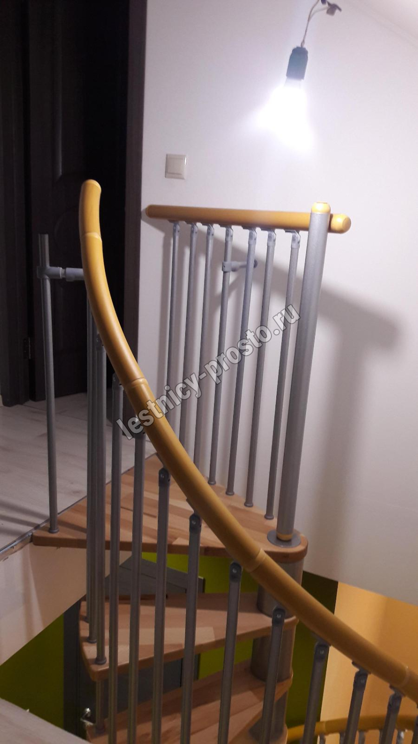 Поручень лестницы изготовлен из массива дуба в тон ступеням. Ступени и поручень покрыты износостойким защитным лаком.